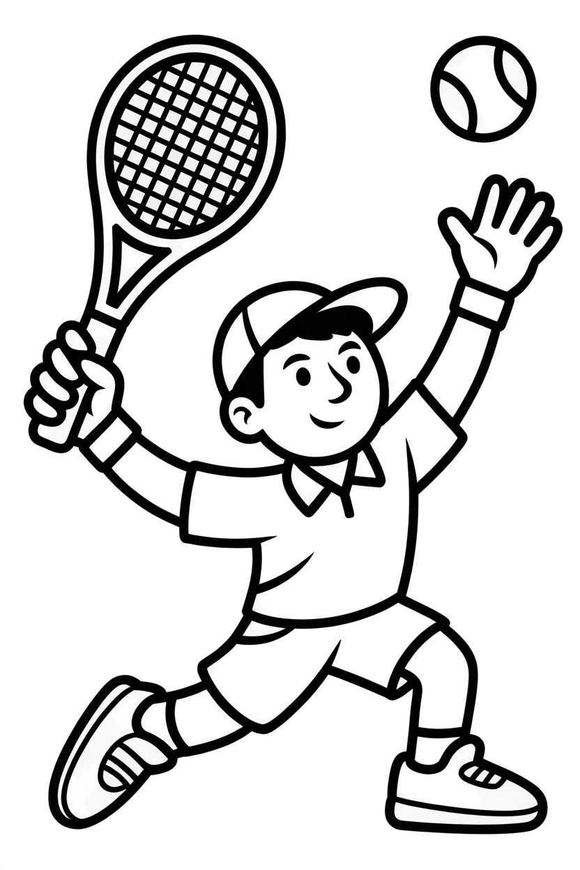 Een jonge tennisser staat in serveerhouding met zijn racket omhoog en de bal zwevend boven zijn hand. Deze kleurplaat uit de categorie Tennis laat duidelijk zien hoe spannend een servicemoment kan zijn. Klaar om te mikken en te slaan!