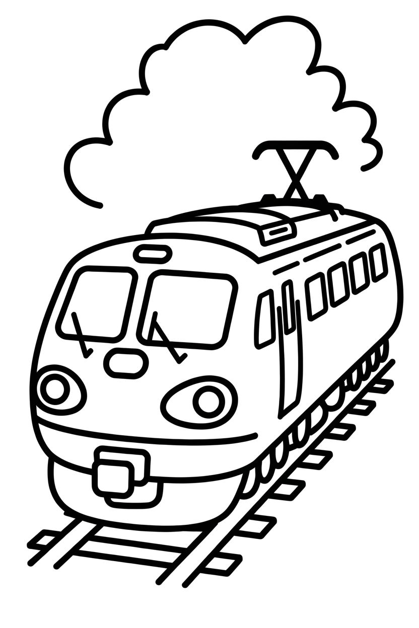Op deze kleurplaat zie je een moderne elektrische trein met een gestroomlijnde voorkant en grote koplampen. De stroomafnemer staat omhoog en maakt contact met de bovenleiding terwijl de trein over het spoor rijdt. Deze kleurplaat uit de wereld van treinen is klaar om ingekleurd te worden door jonge machinisten!