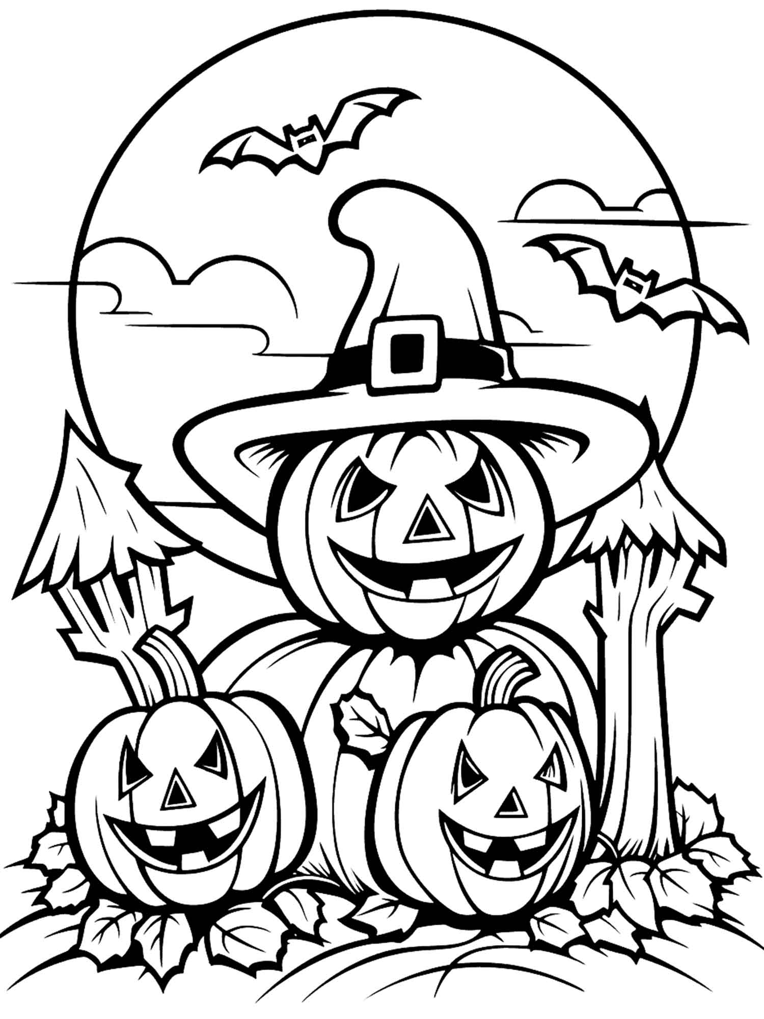 Op deze Halloween kleurplaat zie je een paar uitgesneden Halloween pompoenen. Op de achtergrond ook nog wat vleermuizen. Griezelig zeg!