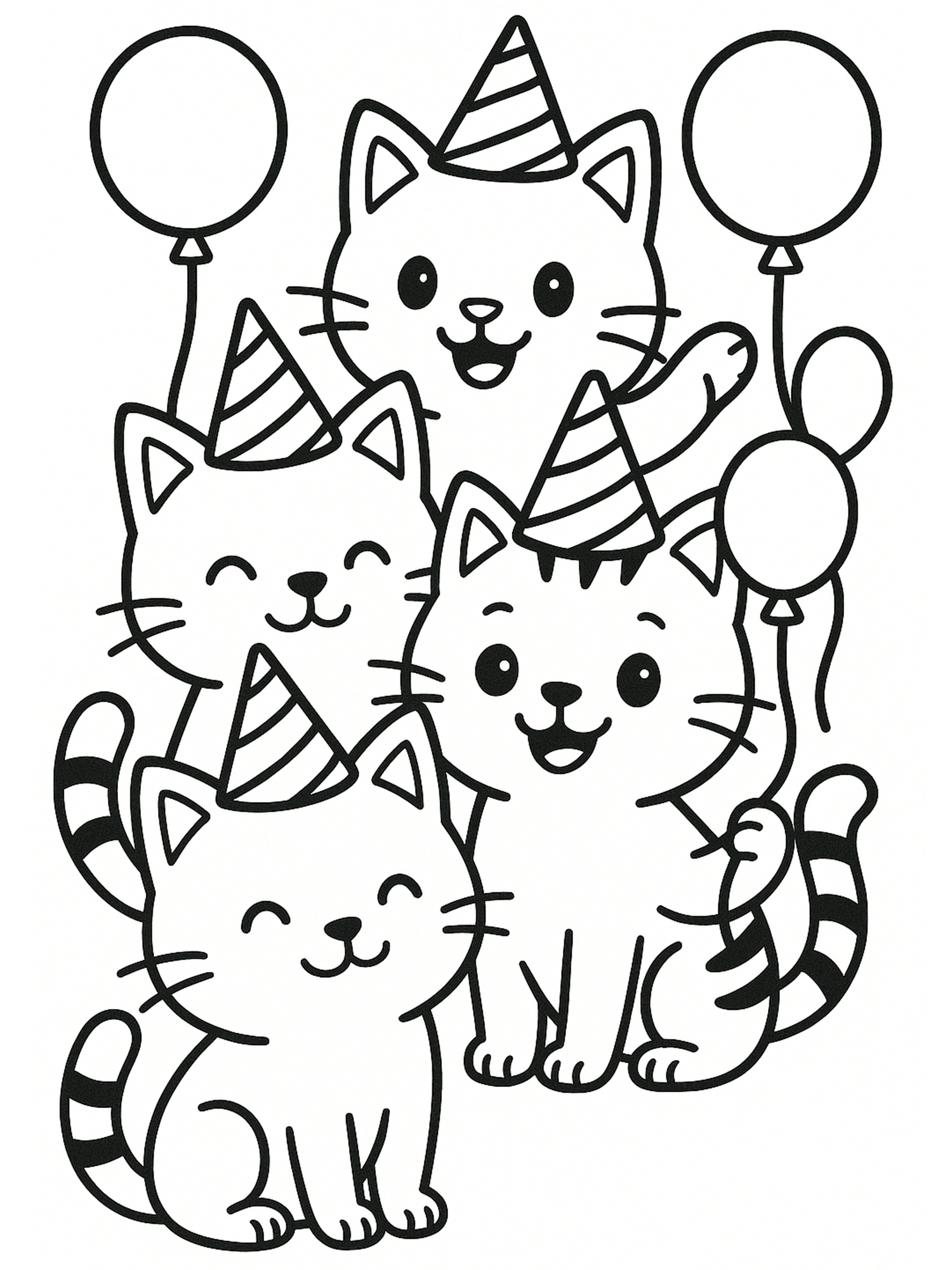 Op deze kleurplaat zie je meerdere katten die een feestje vieren. Ze hebben feesthoedjes op en houden ballonnen vast. Maak er iets kleurrijks van!