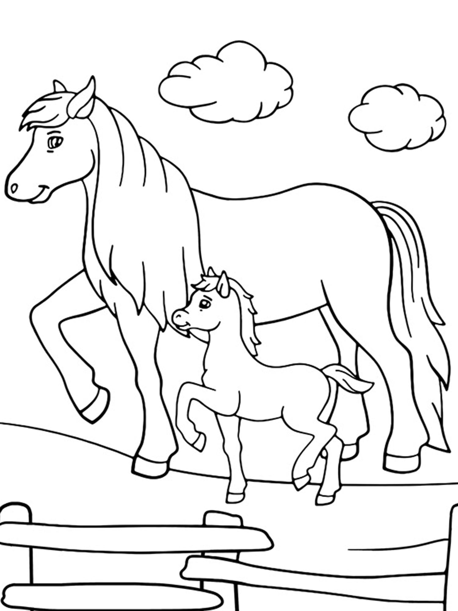 Op deze kleurplaat een paard en een veulen. Een jong van een paard, dat nog geen jaar oud is noemt men een veulen.