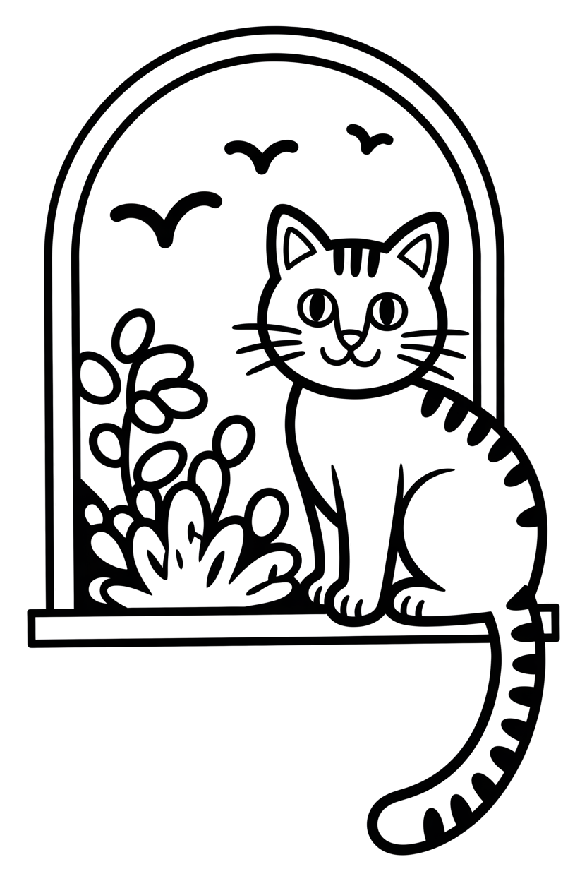 Een gestreepte kat zit op de vensterbank en kijkt naar vogels die boven de struiken in de tuin vliegen. Deze kleurplaat uit de categorie Katten heeft een rustige en gezellige sfeer. Durf jij de kat een bijzonder vachtje te geven?