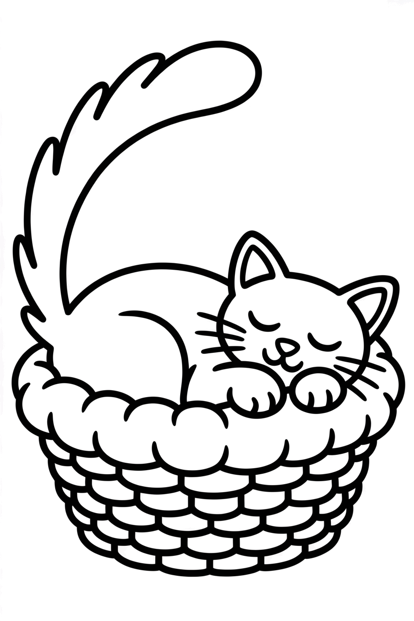 Op deze kleurplaat zie je een lieve kat uit de categorie Katten, die lekker ligt te slapen in een mandje. Ze is opgerold met haar staart omhoog, en rust zacht op een dikke kussenrand. Wat een knusse droomplek!